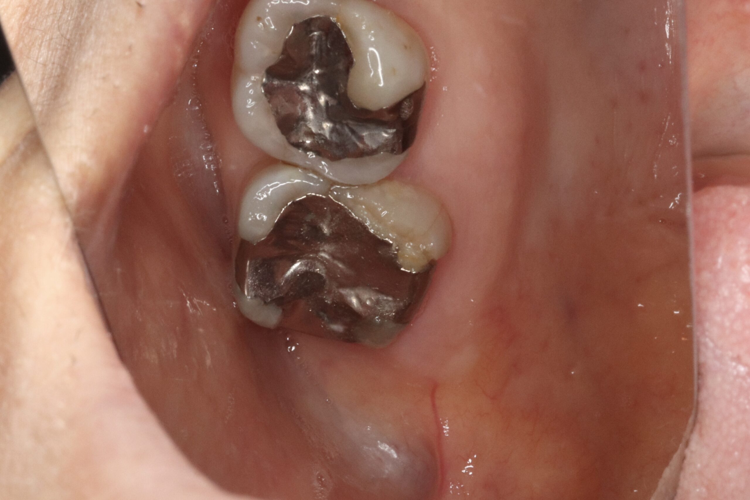 写真から、一番下に見えている歯において、金属とエナメル質との間にプラークが挟まっていることがわかります。