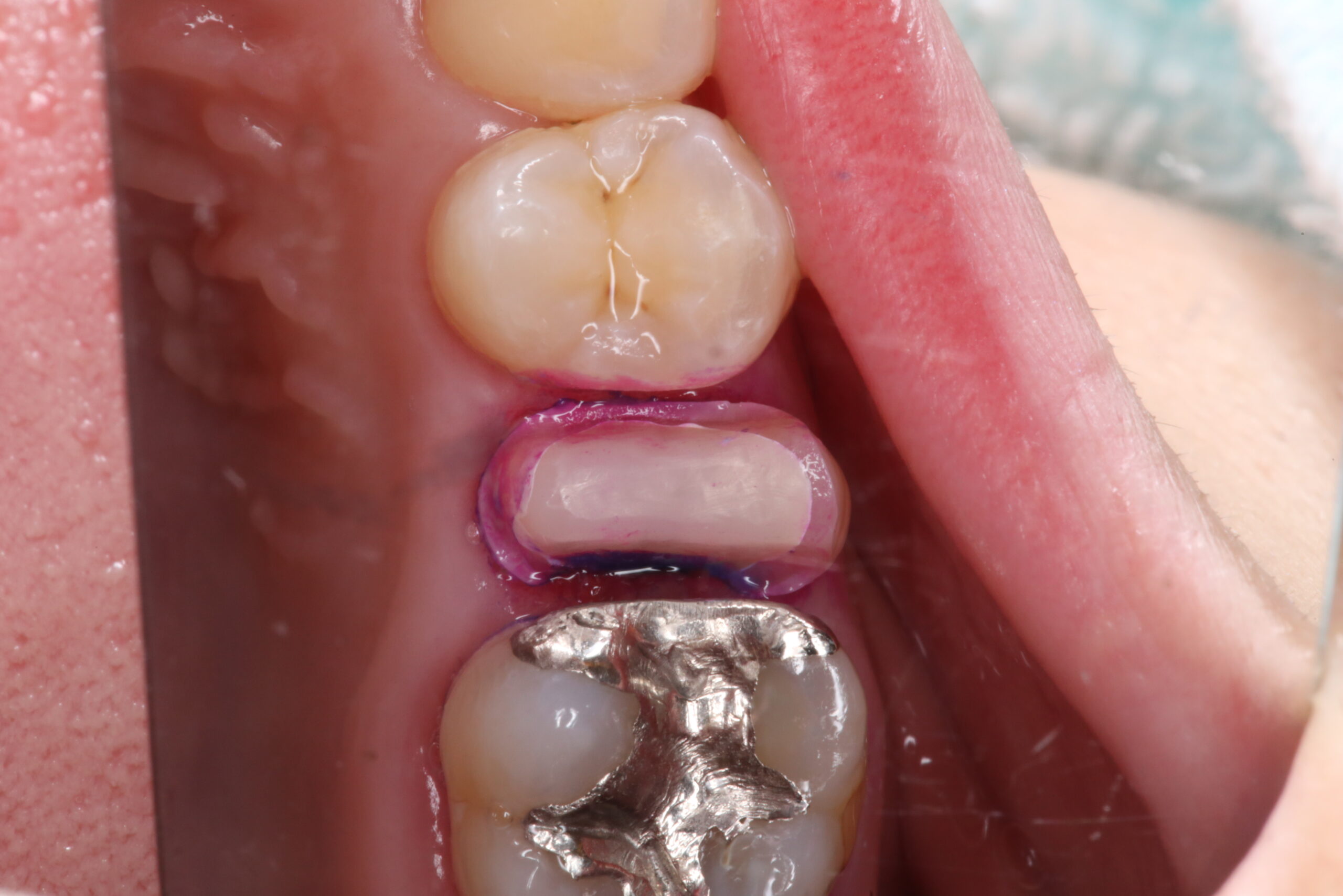なお今回は、表側のエナメル質を可能な限り保存したアンレー形態で修復を行っています。