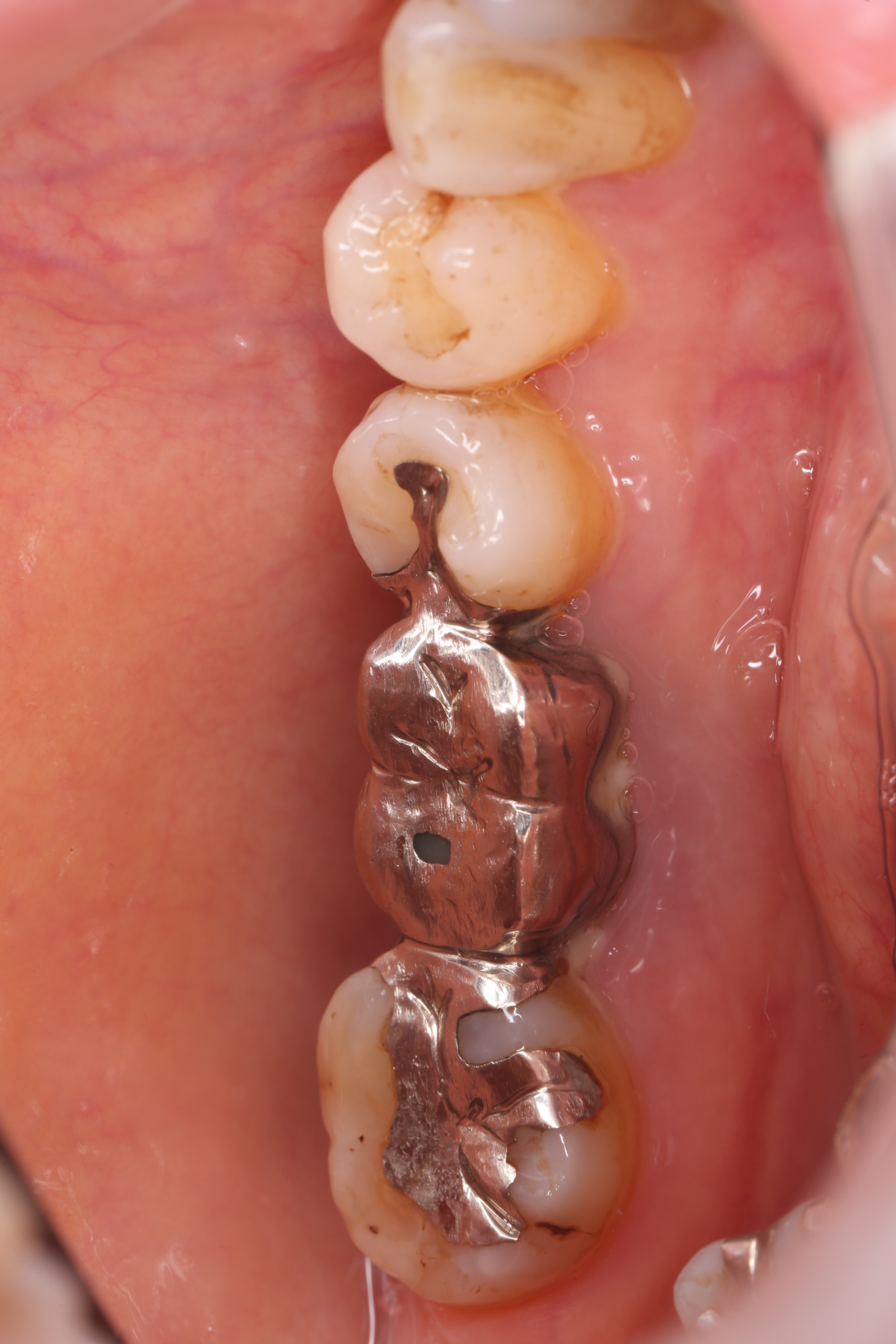 術前の状態です。奥歯の一番後ろの歯にメタルのインレー、後ろから二番目にメタルのクラウン、三番目にメタルのインレーが入っています。