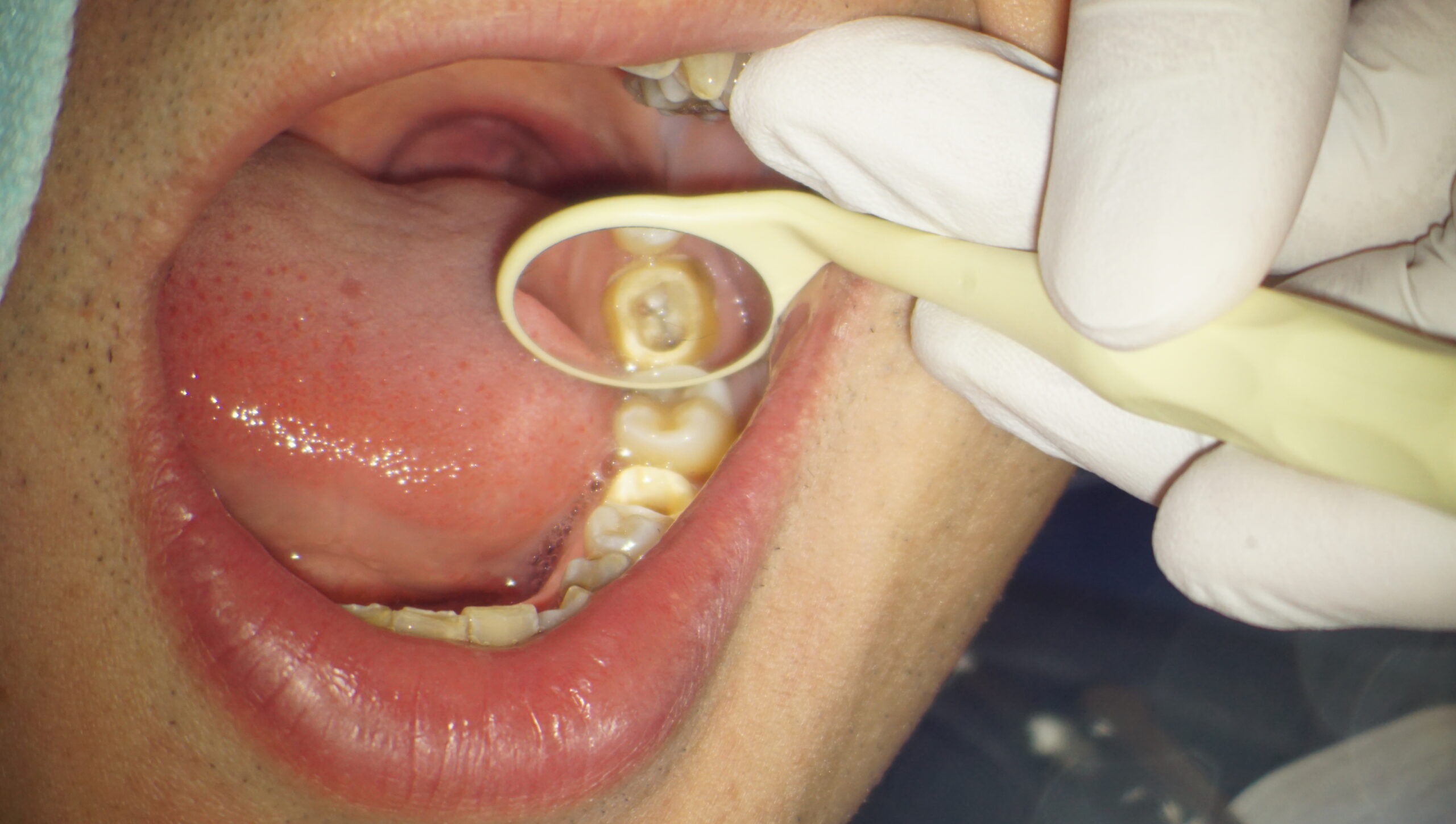 治療を開始する前に、虫歯を染色する液を使って虫歯を可視化します。