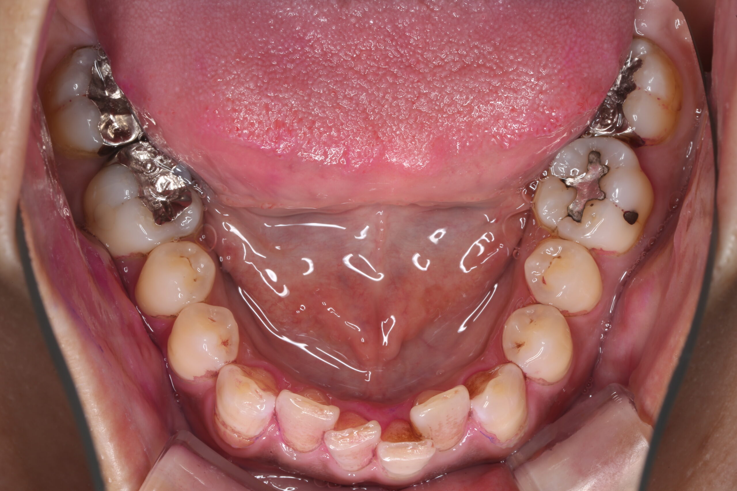 下の前歯に叢生があると噛み合わせが作りにくく、最終的な修復物の寿命が短くなることが多いため、矯正治療で歯並びを整えることになりました。