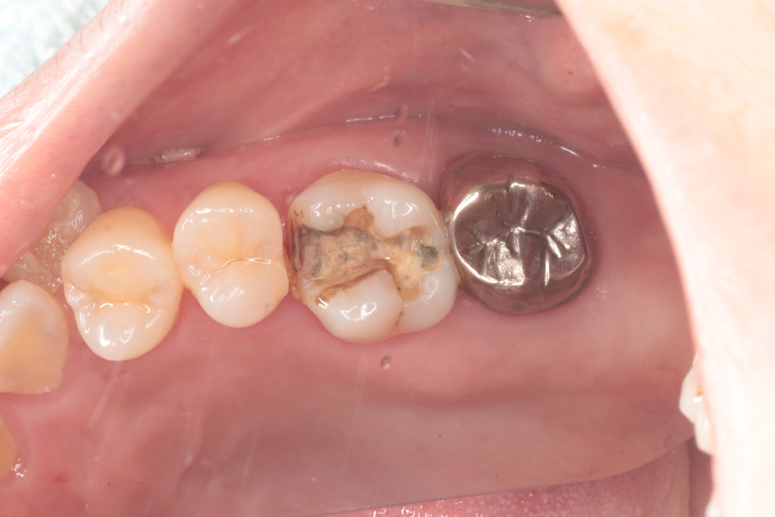 セット前の状態です。神経が生きている歯なので、麻酔を行い、セットの工程を進めます。